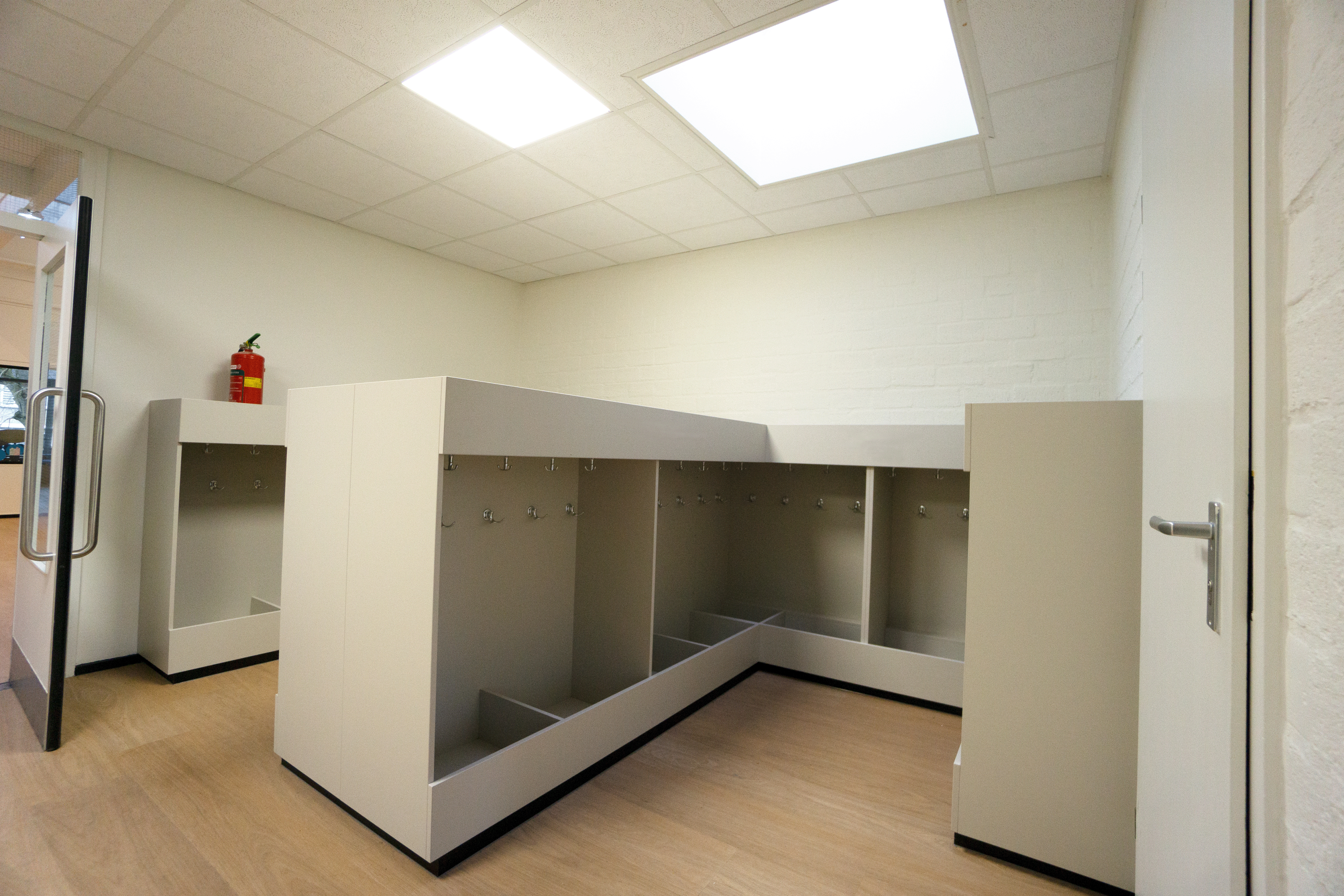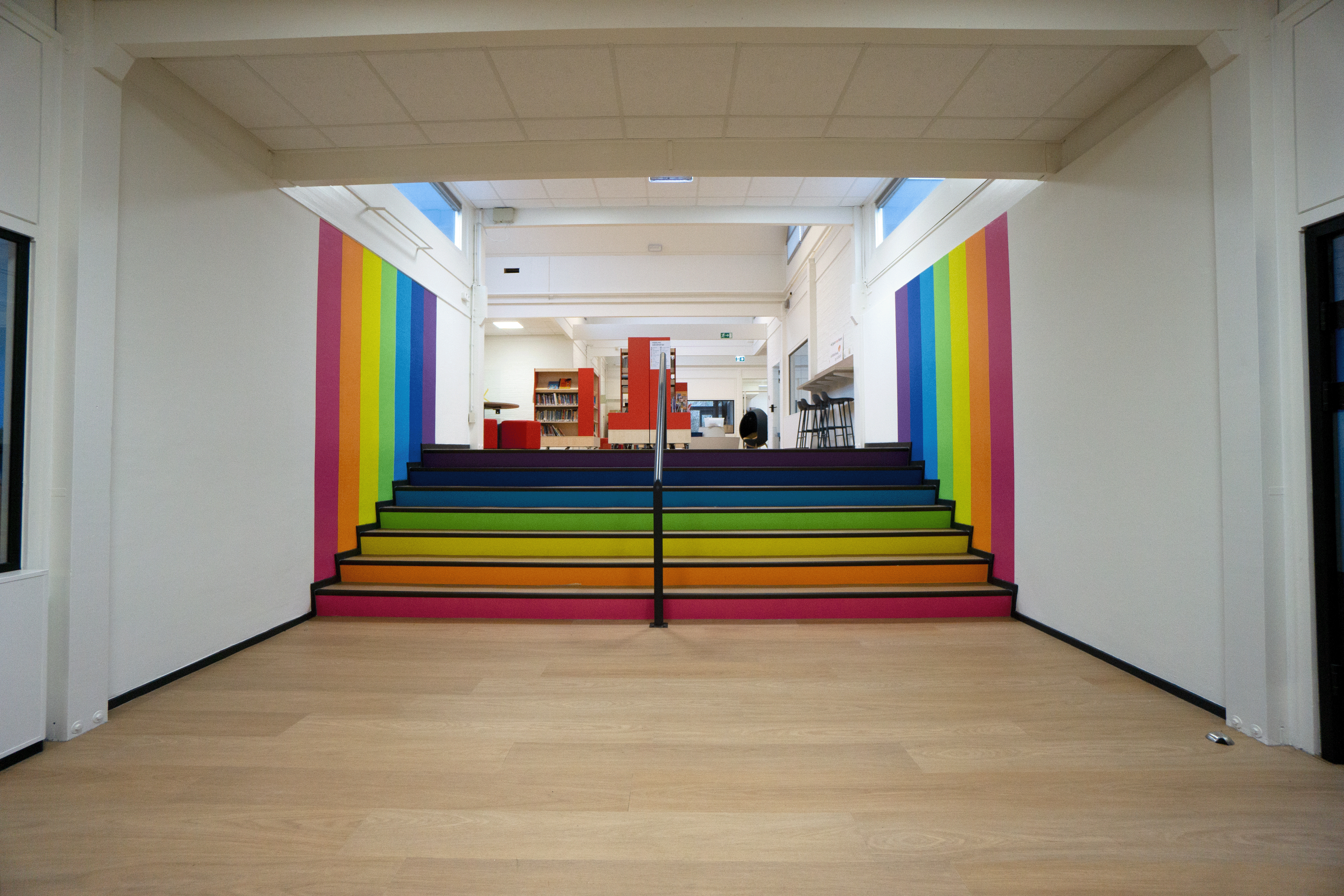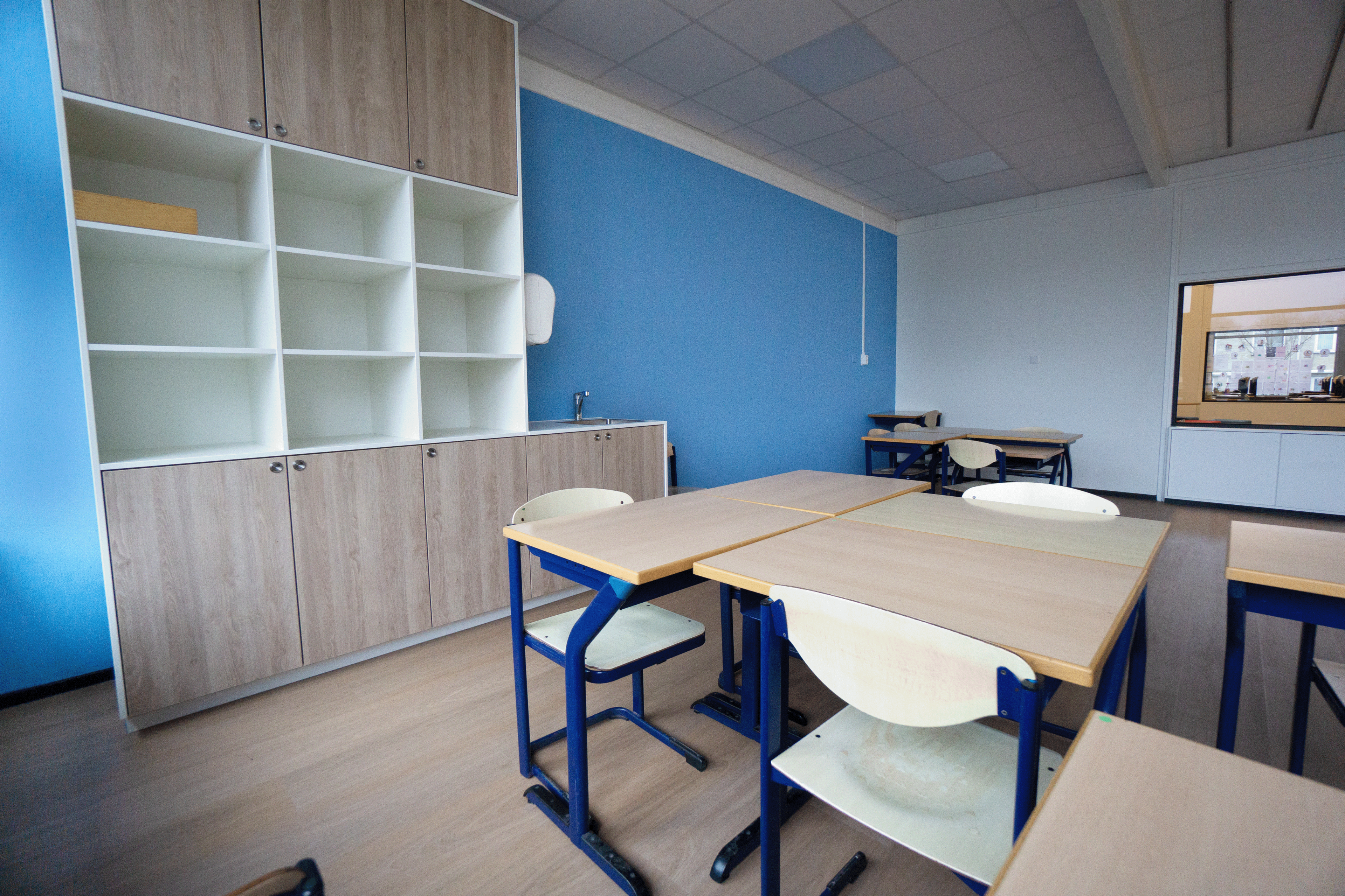 Het schoolgebouw is in meerdere fases gemoderniseerd, waarbij onderwijs en dagelijks gebruik zoveel mogelijk zijn doorgegaan. De werkzaamheden zijn zorgvuldig gepland en grotendeels uitgevoerd tijdens schoolvakanties om de overlast te beperken. Het project bestond uit de complete binneninrichting, van indelingsvoorstel tot realisatie, afgestemd op de functies binnen het onderwijs. Klaslokalen zijn vernieuwd met nieuwe puien en glaskozijnen, maatwerk pantry’s en onderkasten, en afgewerkt met strakke pvc vloeren en gestucte en geschilderde wanden.