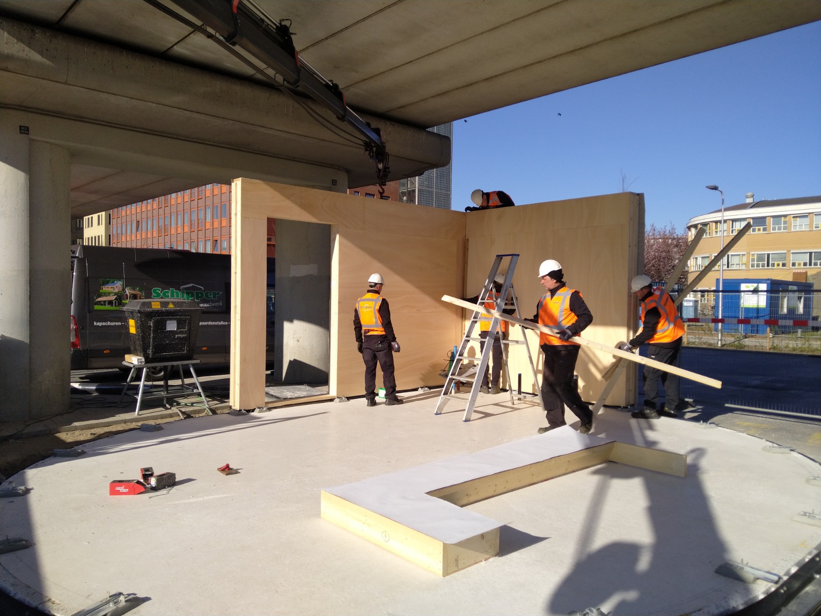 Het project bestond uit het plaatsen van de fundering en het volledig opbouwen van het houtskelet. Aansluitend is de complete technische installatie aangelegd, inclusief warmteterugwinning, verwarming en koeling. De wachtruimte is ingericht met drie toiletten en een keukentje en volledig gebruiksklaar opgeleverd. Ondanks de minimale werk- en opslagruimte is het project zorgvuldig en beheerst uitgevoerd, met oog voor comfort, functionaliteit en duurzaamheid.